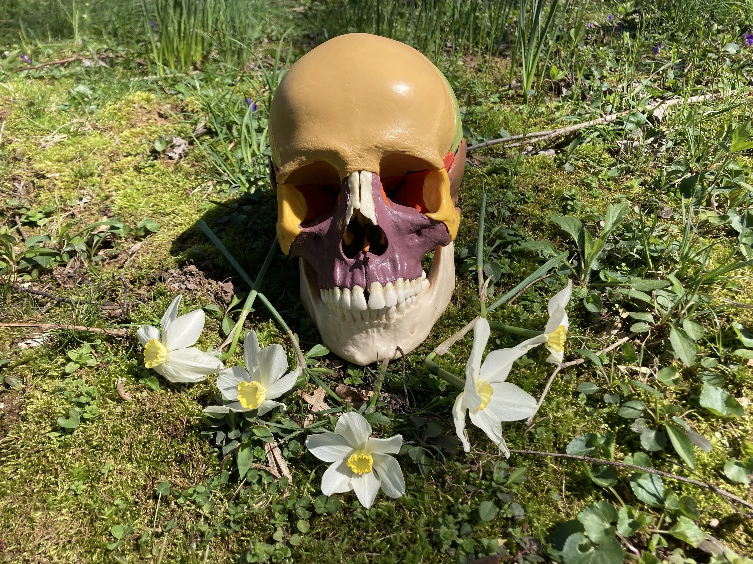 My new CranioSacral teaching tool, Amanda the exploded skull, soaking up the sun with spring daffodils.